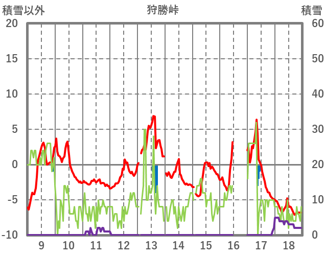 | 日 | 時 | 気温 | 降水 | 風向/風速 | 日照 | 積雪 | 降雪 |