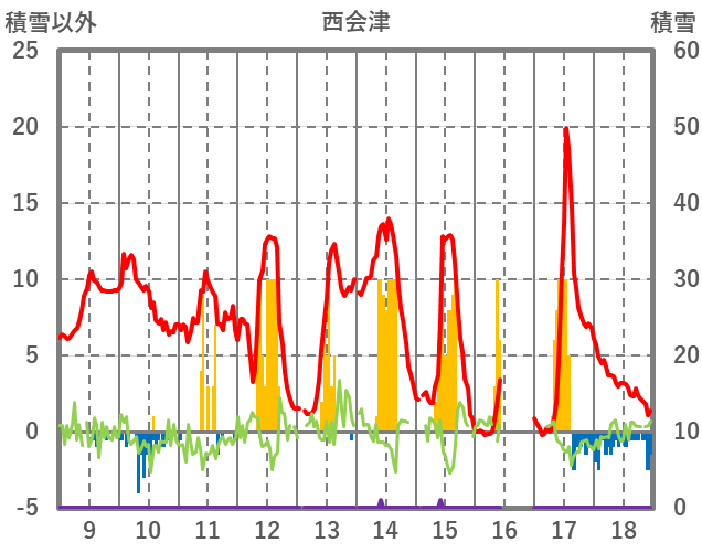 | 日 | 時 | 気温 | 降水 | 風向/風速 | 日照 | 積雪 | 降雪 |