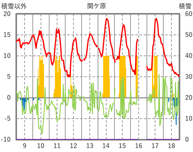 | 日 | 時 | 気温 | 降水 | 風向/風速 | 日照 | 積雪 | 降雪 |