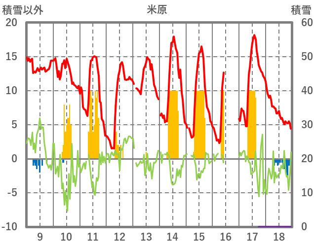 | 日 | 時 | 気温 | 降水 | 風向/風速 | 日照 | 積雪 | 降雪 |