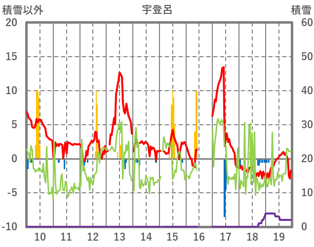 | 日 | 時 | 気温 | 降水 | 風向/風速 | 日照 | 積雪 | 降雪 |