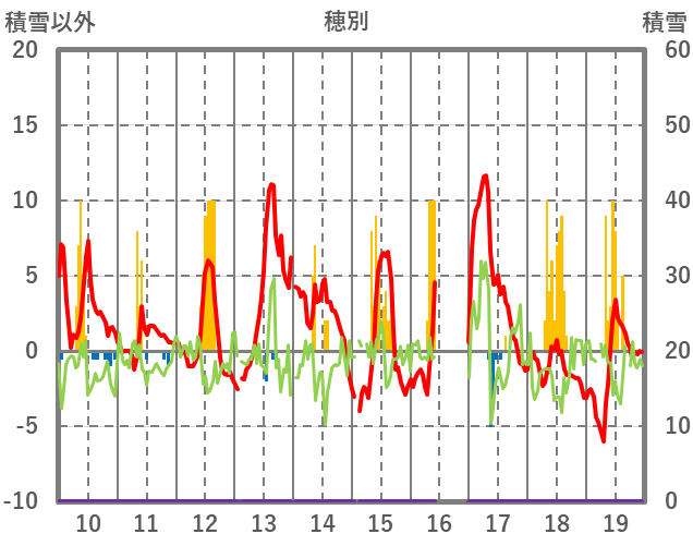 | 日 | 時 | 気温 | 降水 | 風向/風速 | 日照 | 積雪 | 降雪 |