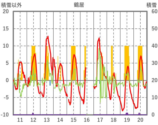 | 日 | 時 | 気温 | 降水 | 風向/風速 | 日照 | 積雪 | 降雪 |