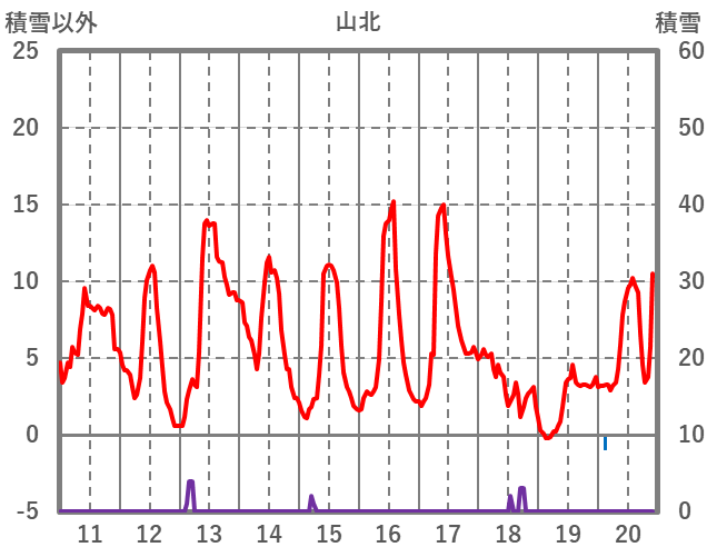 | 日 | 時 | 気温 | 降水 | 風向/風速 | 日照 | 積雪 | 降雪 |
