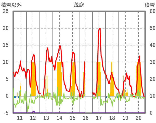 | 日 | 時 | 気温 | 降水 | 風向/風速 | 日照 | 積雪 | 降雪 |