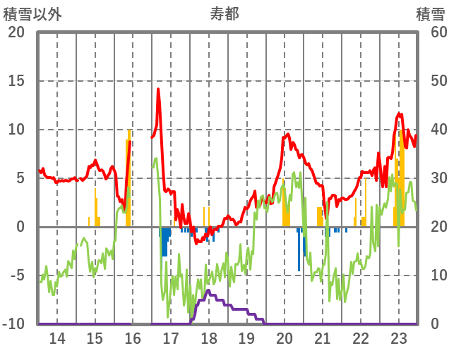 | 日 | 時 | 気温 | 降水 | 風向/風速 | 日照 | 積雪 | 降雪 |