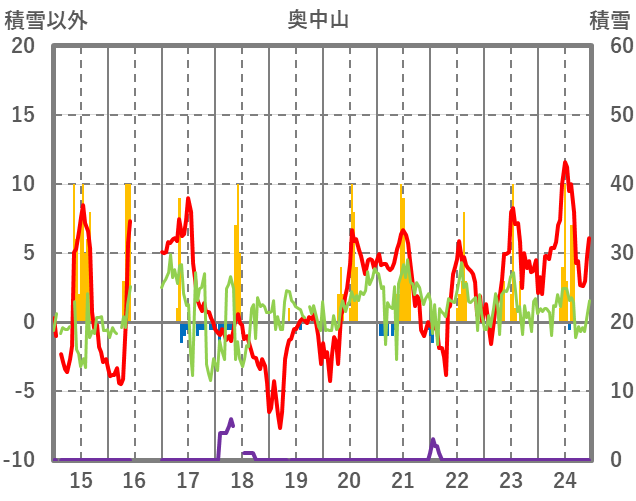 | 日 | 時 | 気温 | 降水 | 風向/風速 | 日照 | 積雪 | 降雪 |