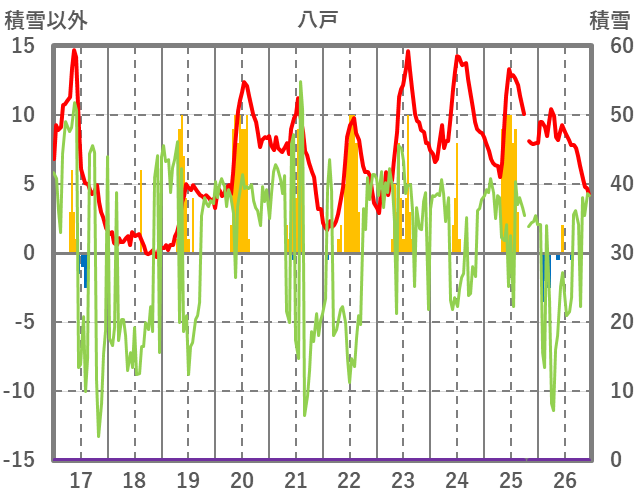 | 日 | 時 | 気温 | 降水 | 風向/風速 | 日照 | 積雪 | 降雪 |