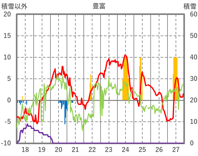 | 日 | 時 | 気温 | 降水 | 風向/風速 | 日照 | 積雪 | 降雪 |