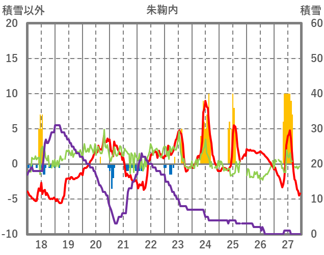 | 日 | 時 | 気温 | 降水 | 風向/風速 | 日照 | 積雪 | 降雪 |