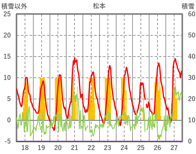 | 日 | 時 | 気温 | 降水 | 風向/風速 | 日照 | 積雪 | 降雪 |