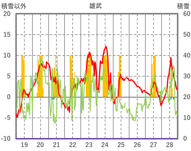 | 日 | 時 | 気温 | 降水 | 風向/風速 | 日照 | 積雪 | 降雪 |