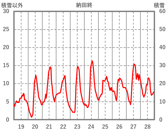 | 日 | 時 | 気温 | 降水 | 風向/風速 | 日照 | 積雪 | 降雪 |