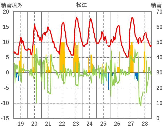 | 日 | 時 | 気温 | 降水 | 風向/風速 | 日照 | 積雪 | 降雪 |