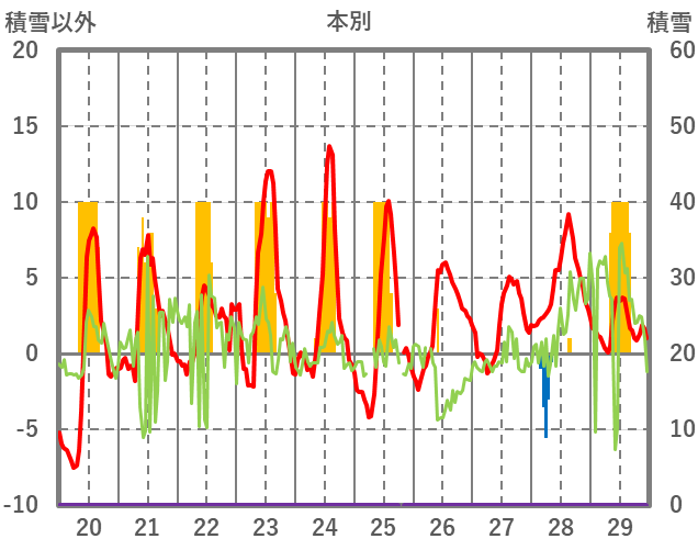 | 日 | 時 | 気温 | 降水 | 風向/風速 | 日照 | 積雪 | 降雪 |