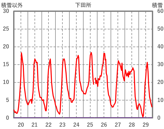 | 日 | 時 | 気温 | 降水 | 風向/風速 | 日照 | 積雪 | 降雪 |