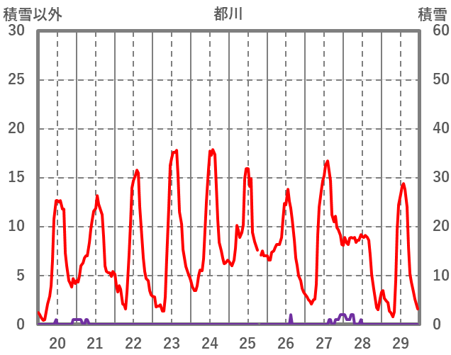 | 日 | 時 | 気温 | 降水 | 風向/風速 | 日照 | 積雪 | 降雪 |