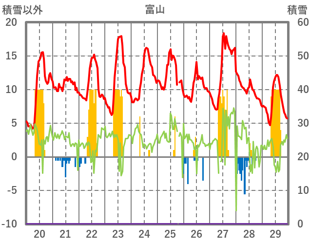 | 日 | 時 | 気温 | 降水 | 風向/風速 | 日照 | 積雪 | 降雪 |