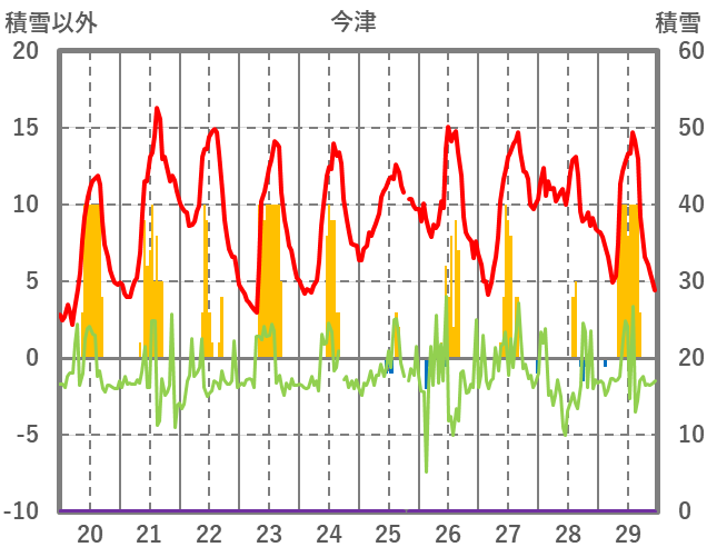 | 日 | 時 | 気温 | 降水 | 風向/風速 | 日照 | 積雪 | 降雪 |