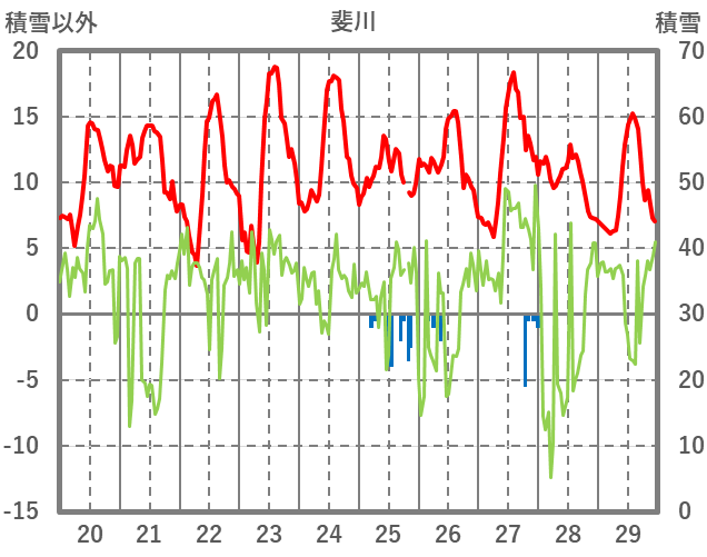 | 日 | 時 | 気温 | 降水 | 風向/風速 | 日照 | 積雪 | 降雪 |