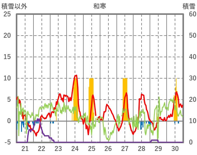 | 日 | 時 | 気温 | 降水 | 風向/風速 | 日照 | 積雪 | 降雪 |