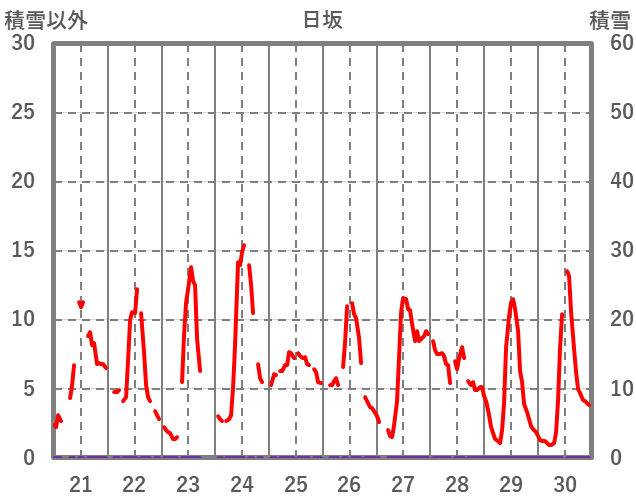 | 日 | 時 | 気温 | 降水 | 風向/風速 | 日照 | 積雪 | 降雪 |