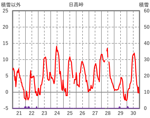 | 日 | 時 | 気温 | 降水 | 風向/風速 | 日照 | 積雪 | 降雪 |