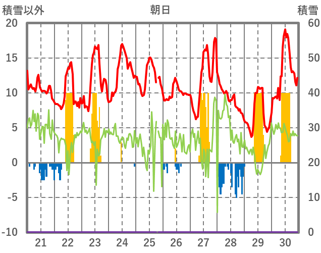 | 日 | 時 | 気温 | 降水 | 風向/風速 | 日照 | 積雪 | 降雪 |