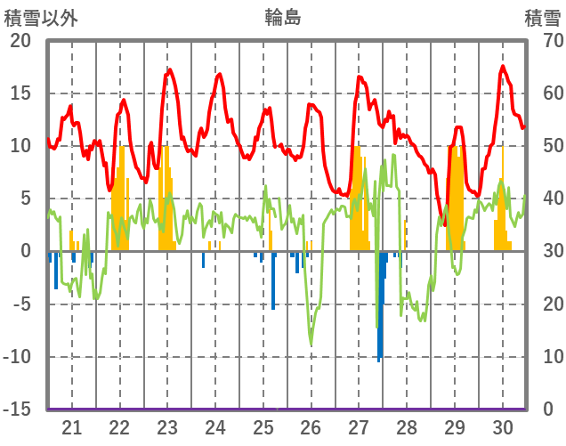 | 日 | 時 | 気温 | 降水 | 風向/風速 | 日照 | 積雪 | 降雪 |