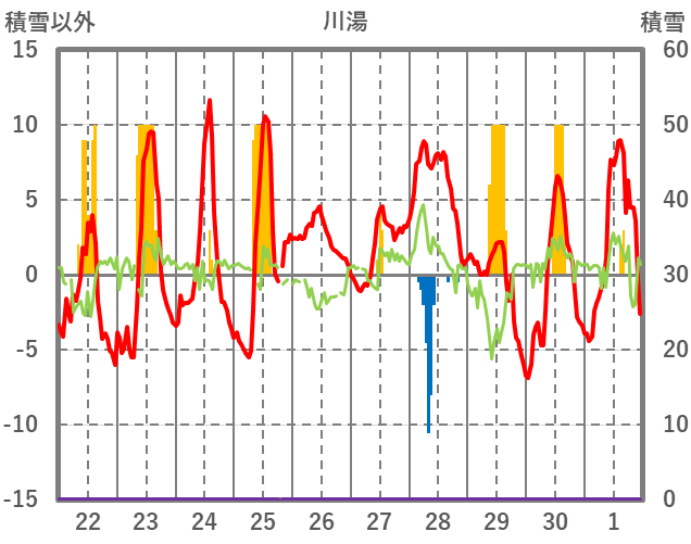 | 日 | 時 | 気温 | 降水 | 風向/風速 | 日照 | 積雪 | 降雪 |