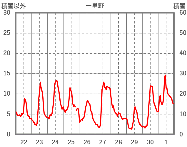 | 日 | 時 | 気温 | 降水 | 風向/風速 | 日照 | 積雪 | 降雪 |