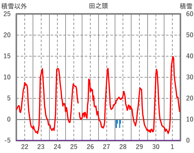 | 日 | 時 | 気温 | 降水 | 風向/風速 | 日照 | 積雪 | 降雪 |