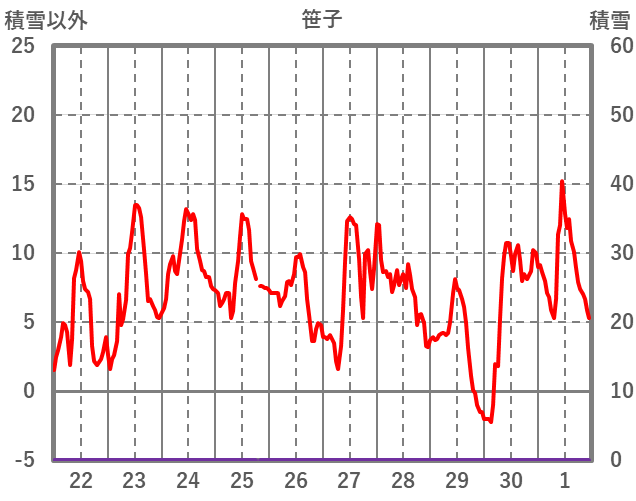 | 日 | 時 | 気温 | 降水 | 風向/風速 | 日照 | 積雪 | 降雪 |