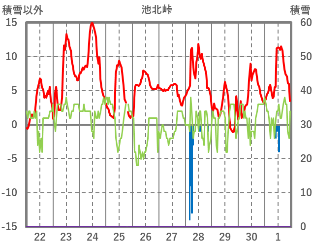| 日 | 時 | 気温 | 降水 | 風向/風速 | 日照 | 積雪 | 降雪 |