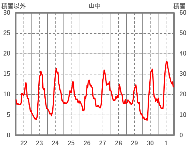 | 日 | 時 | 気温 | 降水 | 風向/風速 | 日照 | 積雪 | 降雪 |