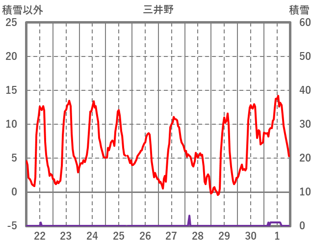 | 日 | 時 | 気温 | 降水 | 風向/風速 | 日照 | 積雪 | 降雪 |