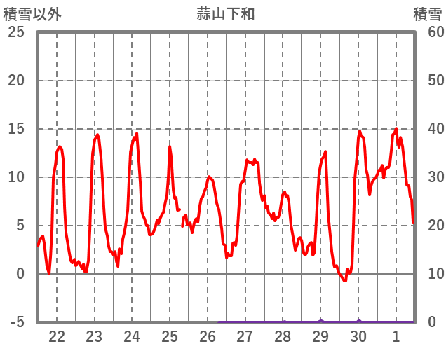 | 日 | 時 | 気温 | 降水 | 風向/風速 | 日照 | 積雪 | 降雪 |