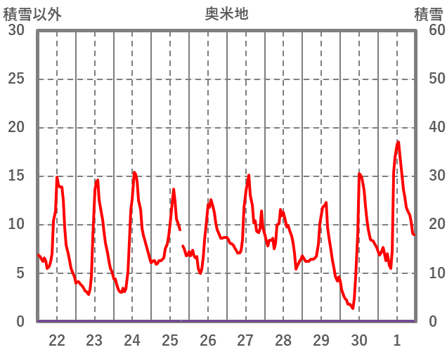 | 日 | 時 | 気温 | 降水 | 風向/風速 | 日照 | 積雪 | 降雪 |
