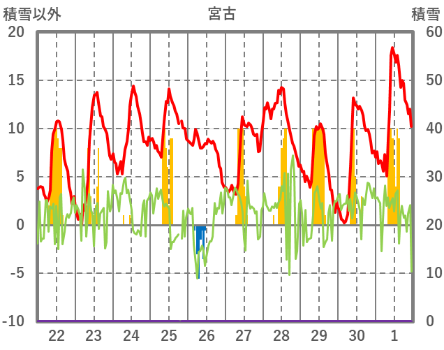 | 日 | 時 | 気温 | 降水 | 風向/風速 | 日照 | 積雪 | 降雪 |