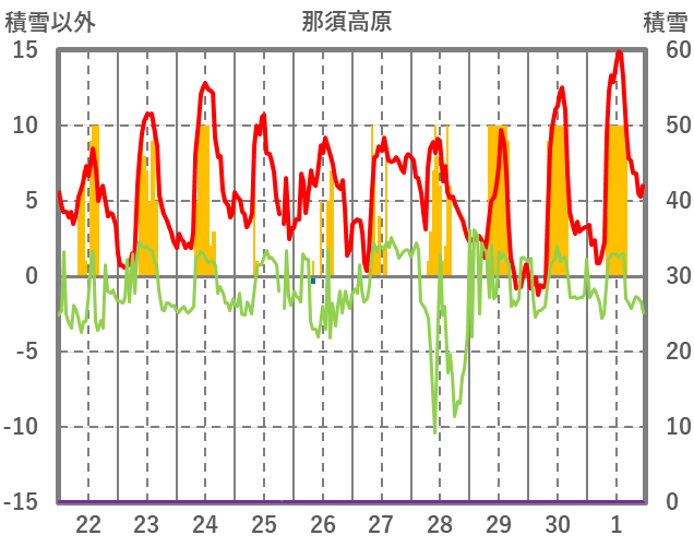 | 日 | 時 | 気温 | 降水 | 風向/風速 | 日照 | 積雪 | 降雪 |