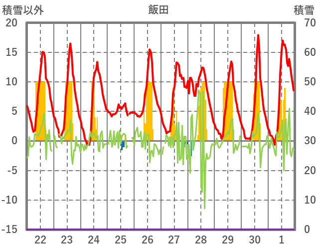 | 日 | 時 | 気温 | 降水 | 風向/風速 | 日照 | 積雪 | 降雪 |