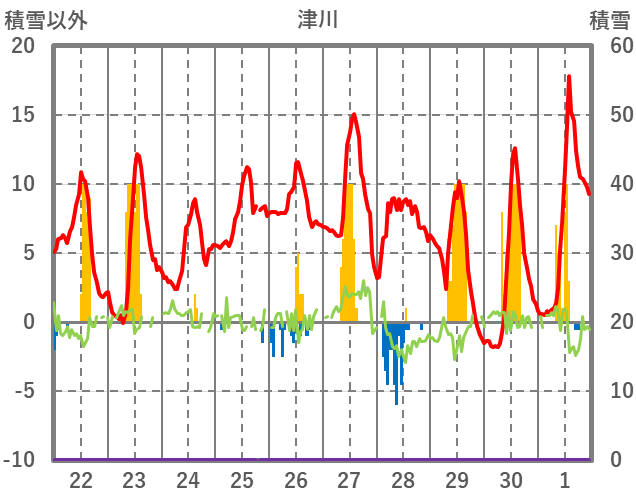 | 日 | 時 | 気温 | 降水 | 風向/風速 | 日照 | 積雪 | 降雪 |