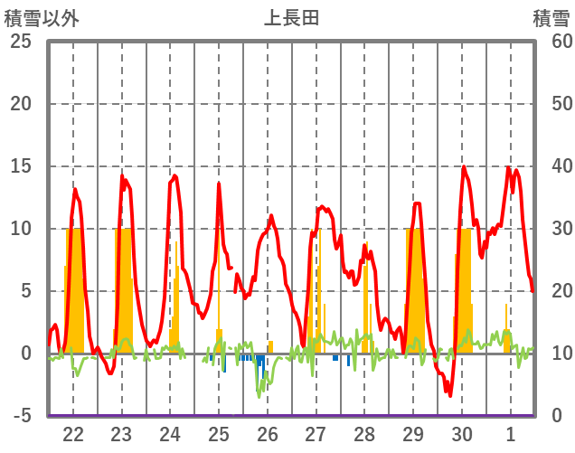 | 日 | 時 | 気温 | 降水 | 風向/風速 | 日照 | 積雪 | 降雪 |