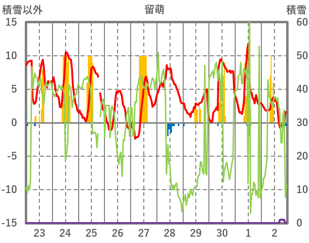 | 日 | 時 | 気温 | 降水 | 風向/風速 | 日照 | 積雪 | 降雪 |