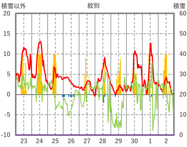 | 日 | 時 | 気温 | 降水 | 風向/風速 | 日照 | 積雪 | 降雪 |