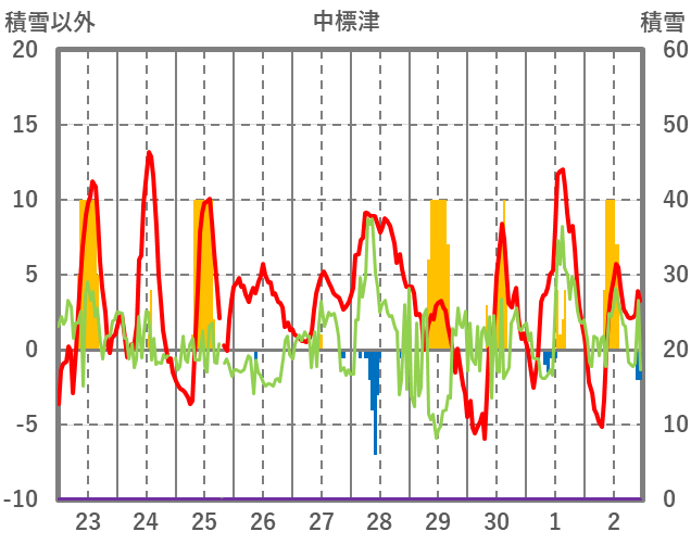 | 日 | 時 | 気温 | 降水 | 風向/風速 | 日照 | 積雪 | 降雪 |