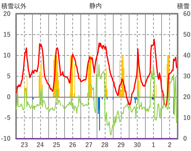 | 日 | 時 | 気温 | 降水 | 風向/風速 | 日照 | 積雪 | 降雪 |
