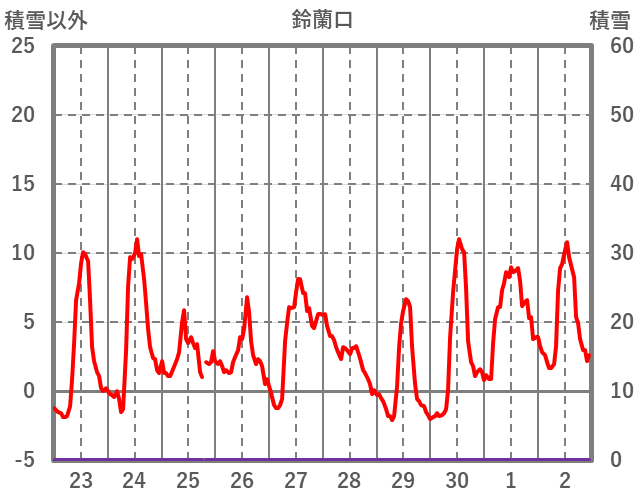 | 日 | 時 | 気温 | 降水 | 風向/風速 | 日照 | 積雪 | 降雪 |