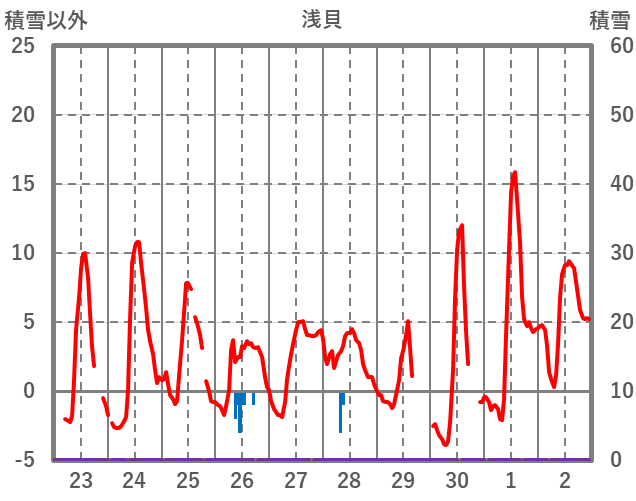 | 日 | 時 | 気温 | 降水 | 風向/風速 | 日照 | 積雪 | 降雪 |