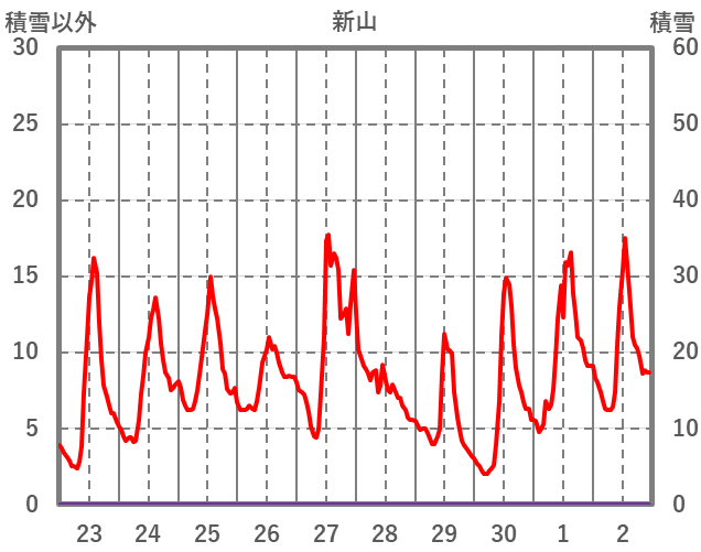 | 日 | 時 | 気温 | 降水 | 風向/風速 | 日照 | 積雪 | 降雪 |